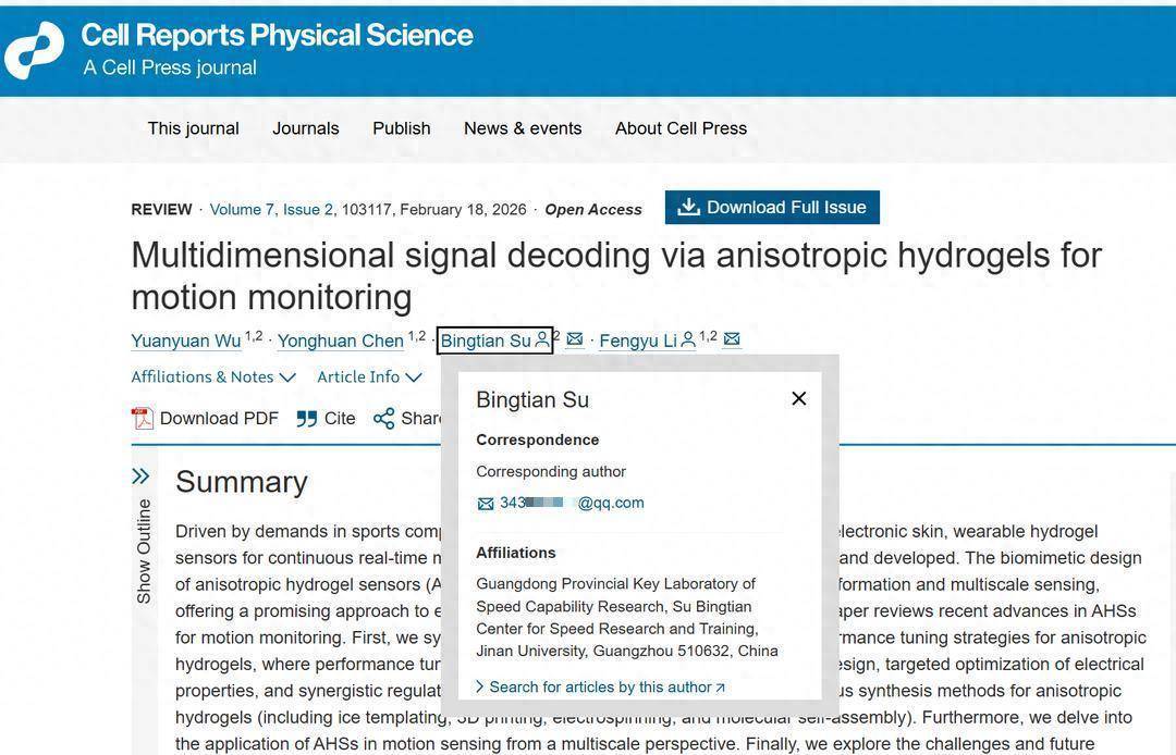 报说念提到,2026年2月18日,暨南大学化学与材料科学学院李风煜教授、暨南大学体育学院苏炳添教授当作共同通讯作家(吴媛媛为论文第一作家),在 Cell 子刊 Cell Reports Physical Science 上发表了题为:Multidimensional Signal Decoding via Anisotropic Hydrogels for Motion Monitoring 的综述论文。